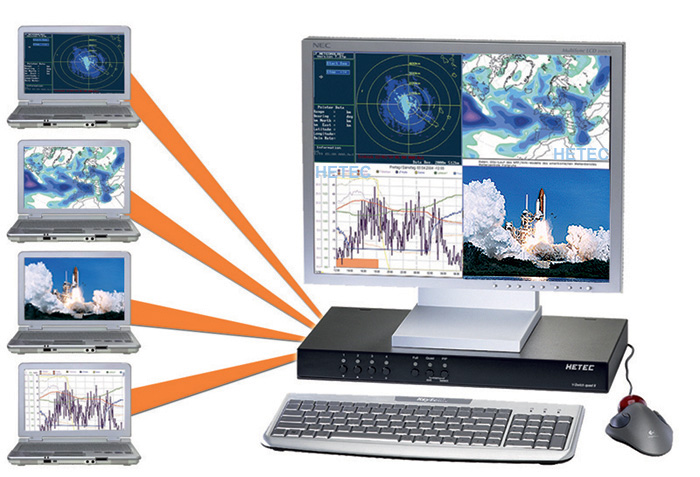 Mit dem V-Switch quad bietet HETEC ein Gerät zur gleichzeitigen Präsentation von vier Abbildungen auf nur einem Bildschirm. Die Signale – analog und digital – aus unterschiedlichen Datenquellen wie Kamera oder Rechner können simultan und in drei verschiedenen Darstellungsoptionen wiedergegeben werden. Im Quad-Modus wird der Monitor in vier gleich große Felder aufgeteilt, die jeweils das Bild einer Videoquelle oder die Information eines Computers zeigen. In der Vollbilddarstellung wird je einer der vier Quadranten in voller Größe und maximaler Auflösung angezeigt. In der PiP-Funktion (Picture in Picture) werden die anderen drei Bilder verkleinert auf der rechten Seite zur zusätzlichen Überwachung angezeigt. Kritische Betriebszustände können so sofort behoben und damit ein Ausfall der Anlage vermieden werden. Der Vierfach-KVM-Switch kommt unabhängig von der Betriebsplattform der Server, Clients oder anderer IT-Komponenten zum Einsatz.