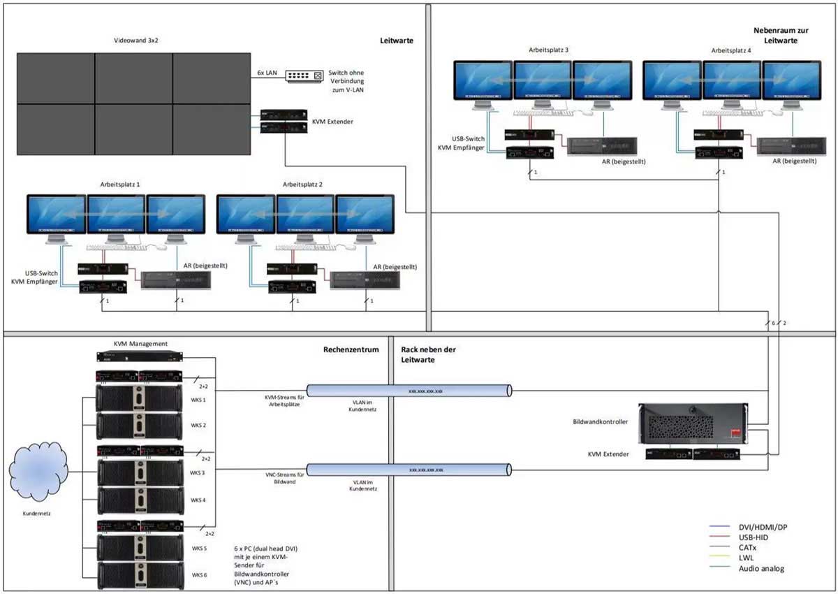 IP-basierte KVM-Systeme sind momentan auf die 1 Gb/s Uplink-Übertragungsgeschwindigkeit der Endpunktgeräte begrenzt. Dadurch steht jedoch genug Bandbreite zur Verfügung, um Full-Motion-Video in einem visuell verlustfreien Modus zu übertragen. Es wird empfohlen, eine dedizierte Netzwerkinfrastruktur für das KVM-System in Erwägung zu ziehen, um die Leistung sicherzustellen.