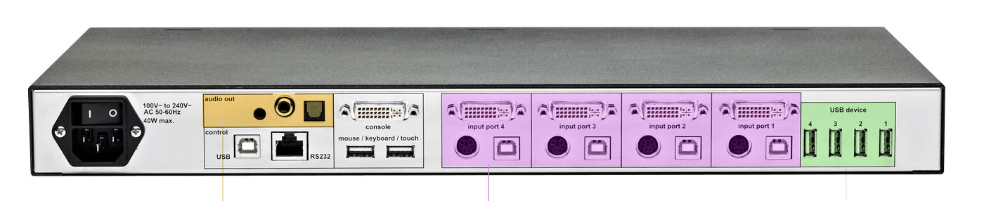 Neben den zwei Anschlüssen für die Eingabegeräte stehen vier weitere USB-Ports zur Verfügung. Angeschlossene Geräte können automatisch mit dem aktiven Kanal verbunden werden.