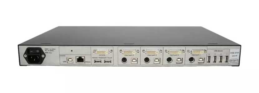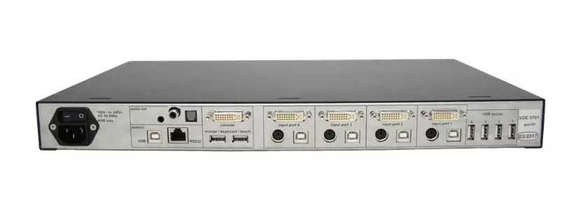 Die Bedienung der angeschlossenen Rechner und Kameras wird durch die integrierte KVM Switch Funktion entweder mit Tastatur Shortcuts, Fronttasten oder Mausbewegung ermöglicht. Werden Touch-Monitore verwendet, ist die Bedienung besonders komfortabel und intuitiv.