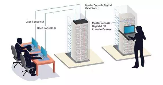 Die MasterConsole Digital-Serie ermöglicht eine effiziente Zugriffskonsolidierung und Steuerung von mehreren Servern für einen oder zwei Benutzer. Modelle sind für KVM-Verbindungen mit 8 oder 16 Servern verfügbar.