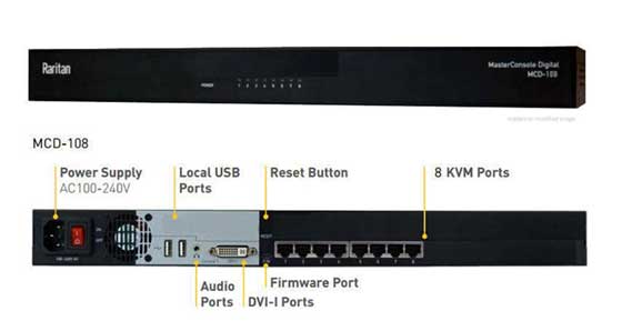 Der MCD unterstützt eine maximale HD-Videoauflösung von 1920 x 1080 mittels standardmäßiger Cat5/6/6e-Kabel. Die digitale Videoschnittstelle bietet Unterstützung für VGA (analog) sowie DVI, HDMI und DisplayPort (digital). Stereo-Audio wird durch die Verwendung von VGA-Kombikabeln oder das HDMI-CIM von Raritan ebenfalls unterstützt.