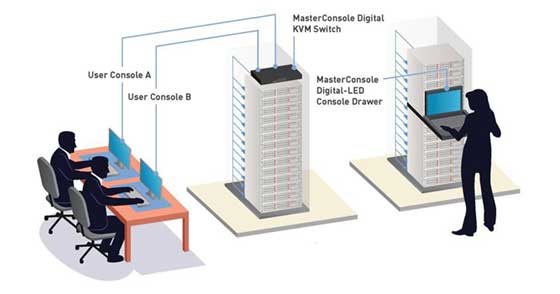 Die MasterConsole Digital-Serie ermöglicht eine effiziente Zugriffskonsolidierung und Steuerung von mehreren Servern für einen oder zwei Benutzer. Modelle sind für KVM-Verbindungen mit 8 Servern verfügbar.