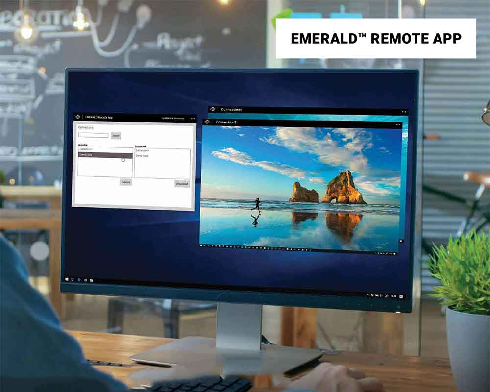 Die Emerald™ Remote App ist eine neuartige Softwarelösung von Black Box, die Benutzern den Zugriff auf mit Emerald verbundene PCs und Server ermöglicht (sowohl physisch als auch virtuell) - von jedem Windows 10-Gerät aus. Die Remote App verbessert die Mobilität beim Gerätezugriff und erleichtert die Steuerung und Kontrolle von Emerald KVM-Netzwerken. Sie unterstützt Full HD-Videoübertragung, wobei mehrere Verbindungen gleichzeitig hergestellt werden können, um die Verwaltung verschiedener Quell-PCs/Server zu erleichtern. Die Emerald Remote App ist der erste Softwareempfänger, der es Benutzern ermöglicht, sich sicher mit Emerald KVM-Sendern und virtuellen Maschinen zu verbinden.