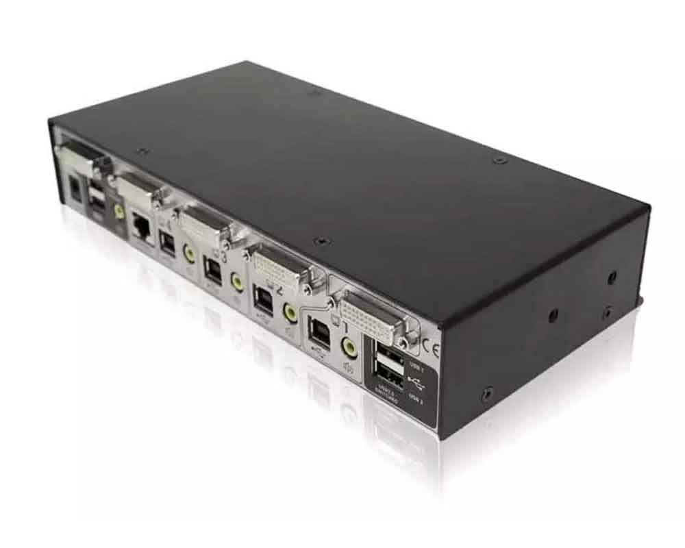 Mit dem Dual Link DVI KVM Switch kann an einer einzigen KVMA Konsole an einem Rechner gearbeitet werden, während die USB 2.0 Peripheriegeräte auf die anderen Rechner geschaltet sind und Lautsprecher wiederum Musik von wiederum anderen abspielen. Natürlich können sämtliche USB Peripheriegeräte auch auf einen der angeschlossenen Rechner geschaltet werden – wie mit jedem gewöhnlichen KVM Switch.