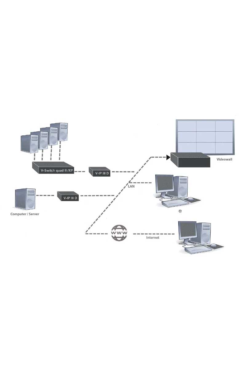 Der KVM-IP-Extender V-IP III D besticht durch einfache Bedienung, gehört zu den kleinsten seiner Art und bietet eine komplette Remote-Management-Lösung mit umfangreichem Funktionsangebot. Bedienen und administrieren Sie einen entfernten Rechner unabhängig vom Ort und vom verwendeten Betriebssystem. Der remote Zugriff erfolgt IP-basierend über Internet, LAN oder WAN. Die hervorragende Videoübertragungsleistung wird durch die Verwendung eines VNC-Viewer wie z.B. RealVNC erreicht. Der V-IP III D kann bis zu 16 Benutzerprofile mit festgelegten Zugriffsrechten erstellen. Bis zu 4 Benutzer gleichzeitig können jederzeit auf das Gerät zugreifen. V-IP III D ist die ideale Ergänzung zu unseren Multiviewern/KVM-Switche V-Switch quad II / XP um die angeschlossenen Computer standortunabhängig fernsteuern zu können. Die VNC-Streams können auch von unseren Bildwandkontrollern zur Anzeige auf Großbildwänden eingebunden werden.