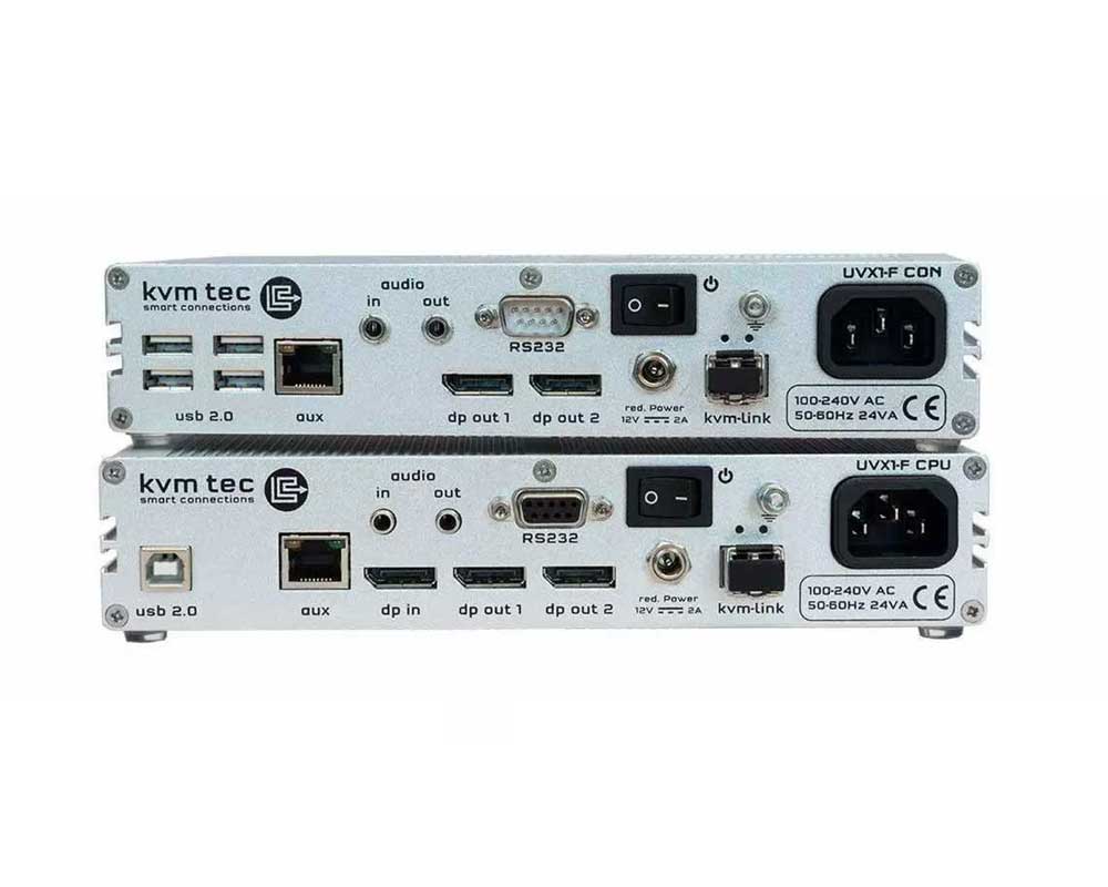 Der 4K Ultraline ist ein Displayport 1.2 Extender over IP in Fiber mit einer Reichweite von 300m bei einer Auflösung von 4096×2160 @ 60Hz mit einer perfekten Farbkodierung mit 4:4:4 @8 bit pro Farbe. Die perfekte Abstimmung der kvm-tec Videokompression mit einer geringen Latenzzeit ermöglicht eine verzögerungsfreie Übertragung der Signale. USB und Video wird über ein Kabel übertragen. 4K Videos in Echtzeit. Der CPU/local und der CON/remote Teil haben zwei lokale Video Outputs, Splitter Funktion mit 4K oder Multistreamsupport bei einer Auflösung bis 2560 x 1400. Der eingebaute MST Hub/Splitter ermöglicht die Absetzung von zwei unterschiedlichen Bildinhalten über ein Kabel bis zu einer max. Auflösung von 2560×1400. Ein AUX Port für remote Wartung ist integriert.
